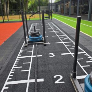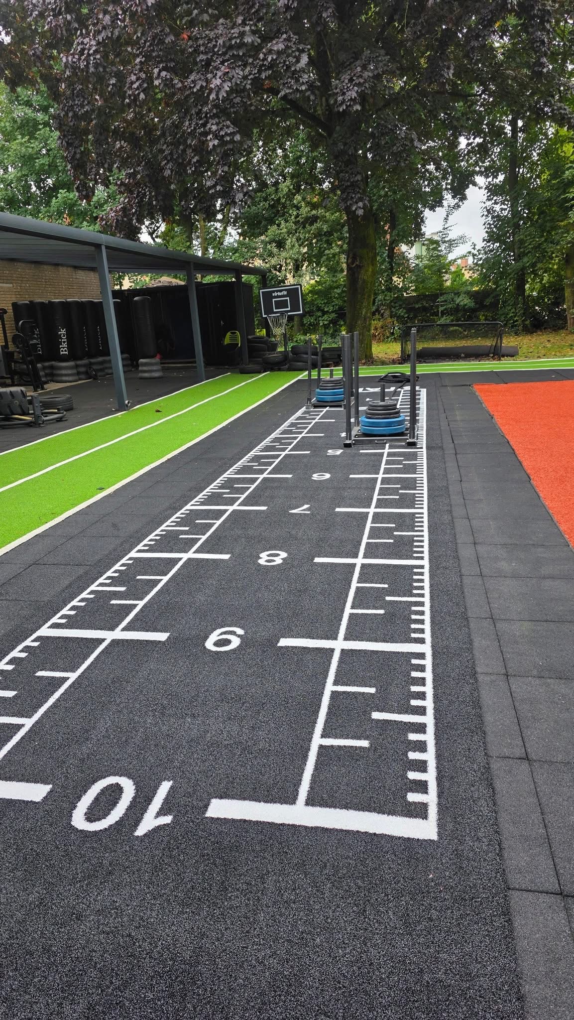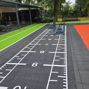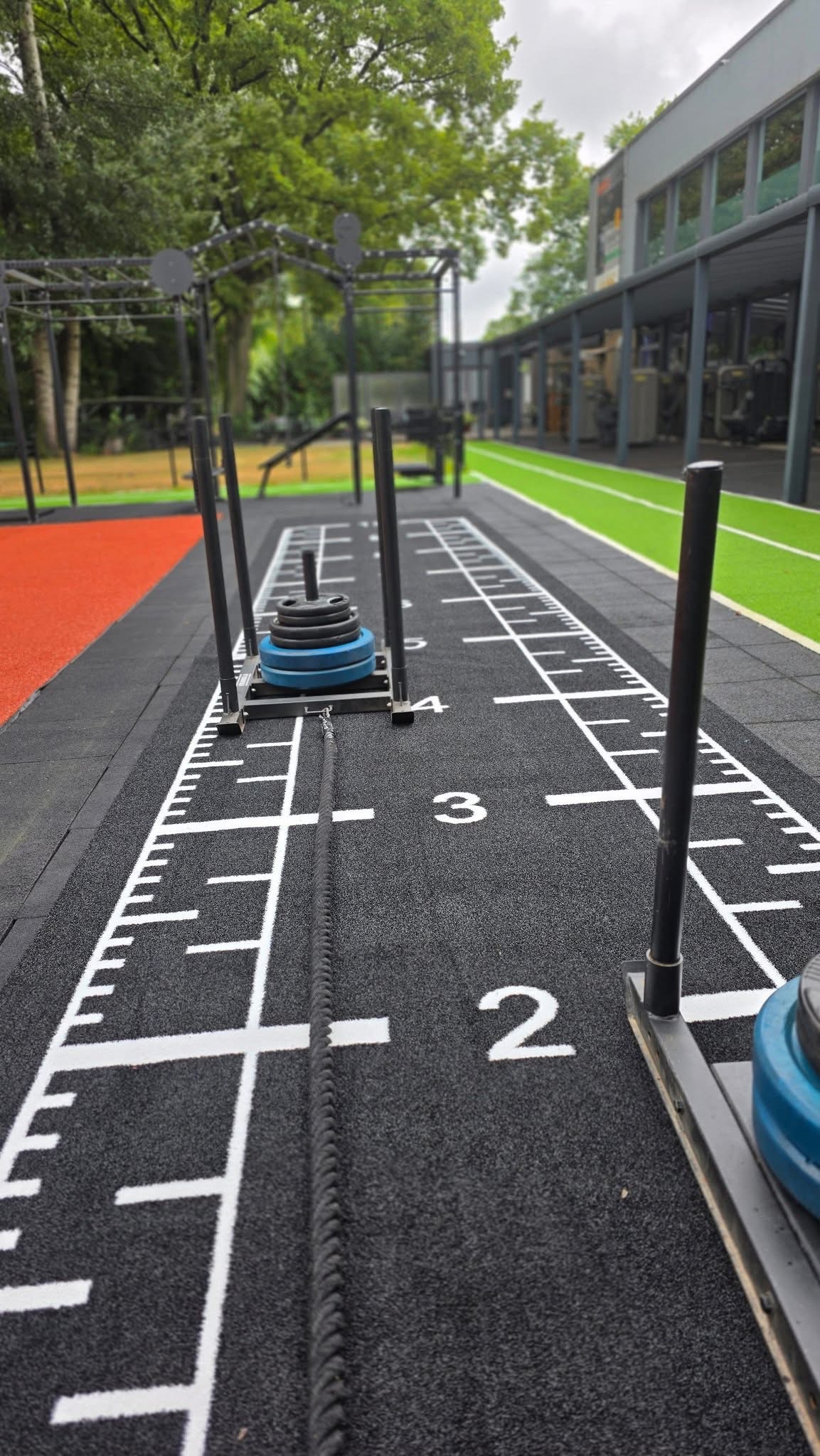 Deze Sprinttrack heeft een extra meter voor de start en een extra lengte meter na de finish wat uniek is voor sprinttracks, dit om extra veel kracht te kunnen zetten bij de aanvang van de krachtsessie en het duwen van de Crossfit slee bijvoorbeeld!